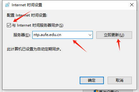 3.勾选“与Internet时间服务器同步”,在服务器栏输入时间同步服务器地址:ntp.aufe.edu.cn,点击“立即更新”(如果同步出现问题可能是Windows Time被禁用),点击“确定”。